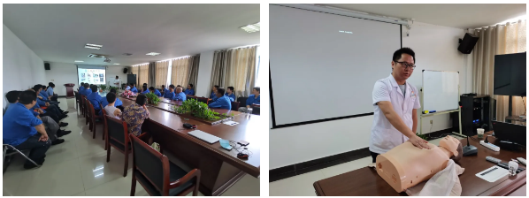 本次活动,由溧水区人民医院骨科的叶林辉主任做“机械伤害相关知识培训”,叶主任对止血包扎、骨折固定和转运、异物扎伤、扭伤、离断伤、烫灼伤、冻伤、触电、溺水、中暑等处置做了详细介绍。对心肺复苏、止血包扎、骨折固定和转运等操作做了示范。
