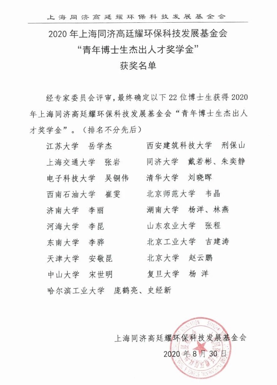 由于疫情原因,上海同济高廷耀环保科技发展基金会 “2020年青年博士生杰出人才奖学金”未举办线下颁奖仪式。本次共有来自清华大学、北京大学、同济大学、东南大学、哈尔滨工业大学、上海交通大学、复旦大学等全国19所高校的22名在读全日制环保及相关领域优秀博士生获奖,每人获4万元奖学金。